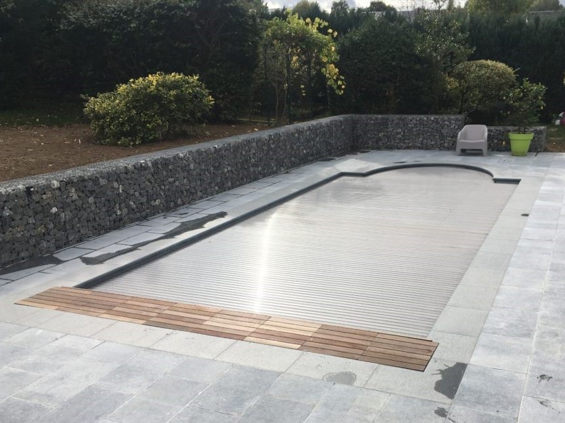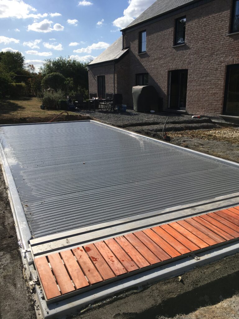 Volet Covrex® gris foncé et son caisson recouvert de caillebotis en bois