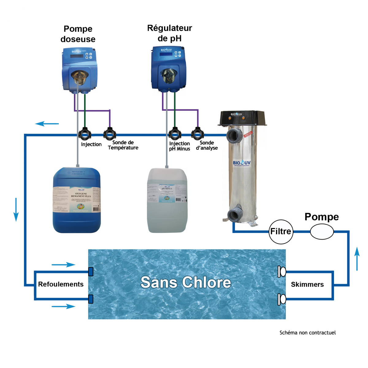 - Pas de produits de piscine nocifs : un simple produit piscine naturel, BIO-UV oxygène rémanent, formule exclusive,