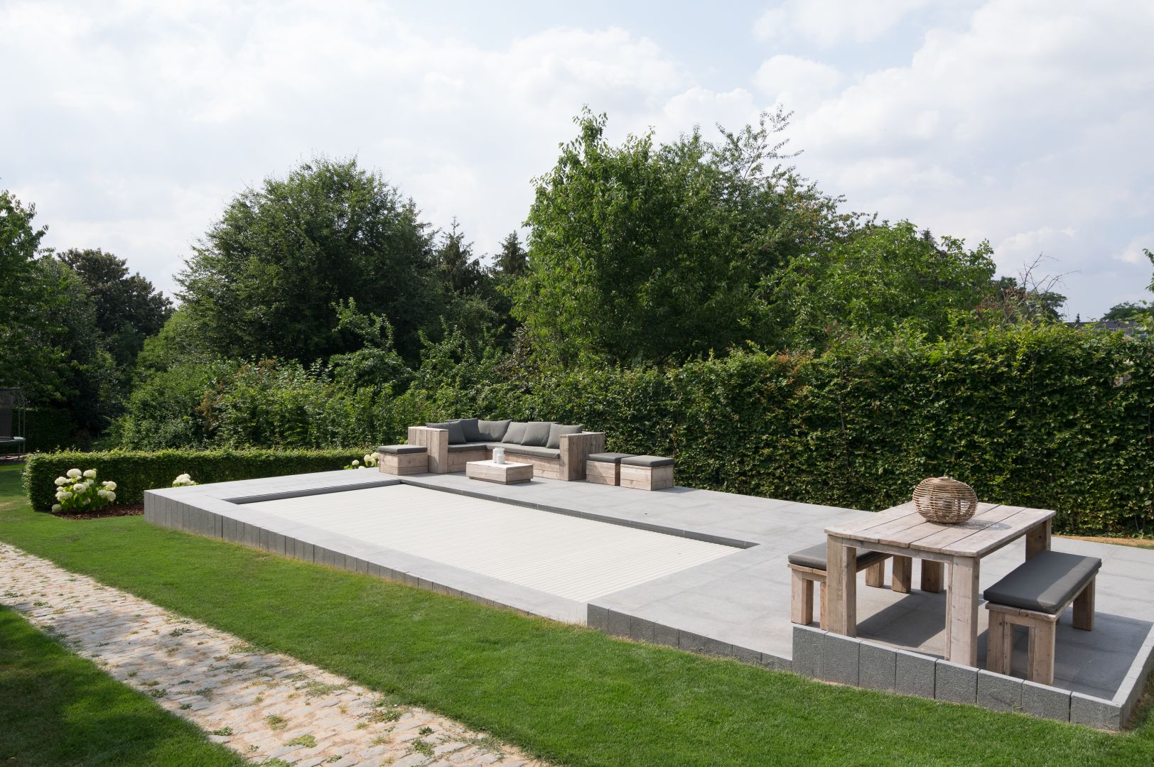 Piscine d’une dimension idéale pour les espaces réduits, équipée d’un volet de sécurité.